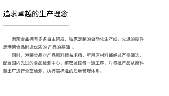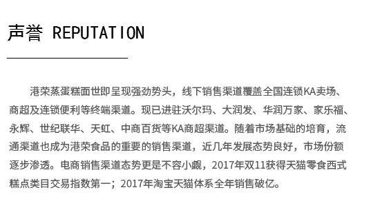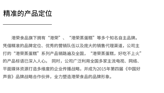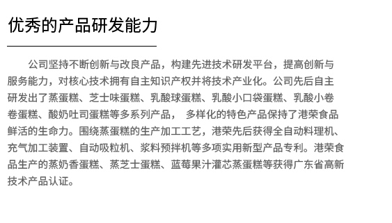 作為率先在國內(nèi)研發(fā)出蒸蛋糕的品牌,港榮食品深信產(chǎn)品是企業(yè)的根本,一直以來也致力于產(chǎn)品研發(fā)和技術(shù)創(chuàng)新。以此推出了以蒸奶香蛋糕為首的蒸系列蛋糕,更創(chuàng)新性地推出了下蒸上烤的蒸芝士蛋糕。“誠信、健康、創(chuàng)新、時(shí)尚”是港榮的經(jīng)營理念,也會(huì)繼續(xù)努力為廣大消費(fèi)者提供更優(yōu)質(zhì)的食品。
